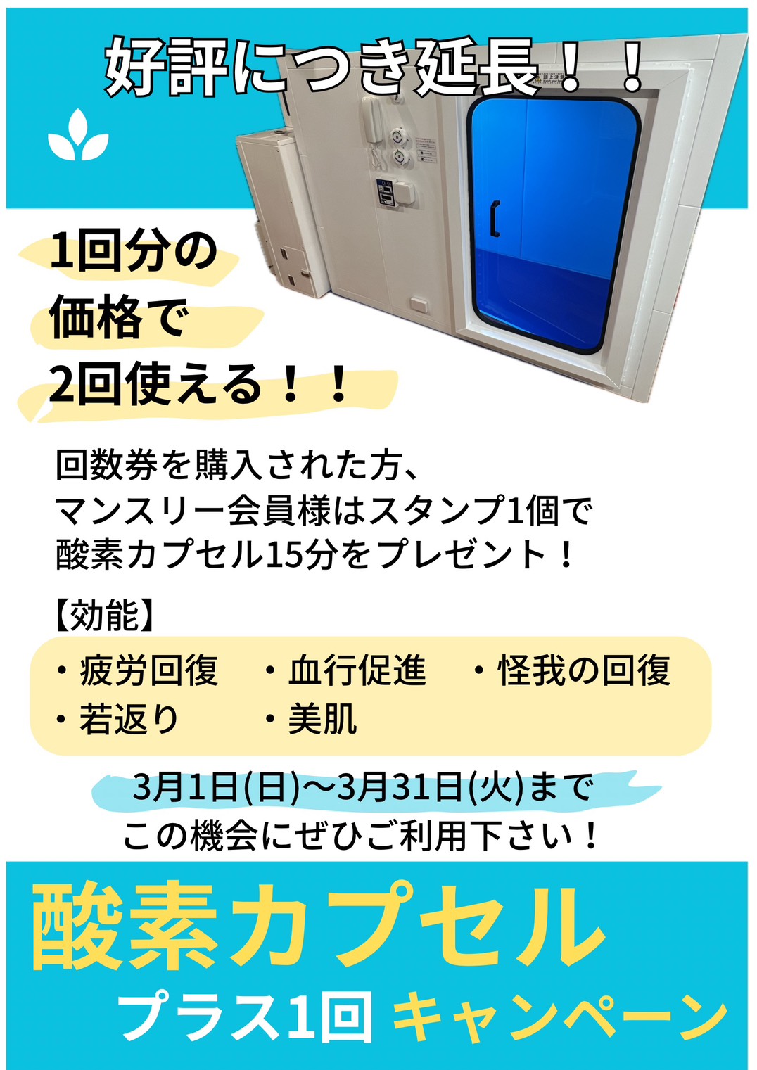 酸素カプセルは非会員様もご利用頂けますのでお気軽にご利用下さませ。